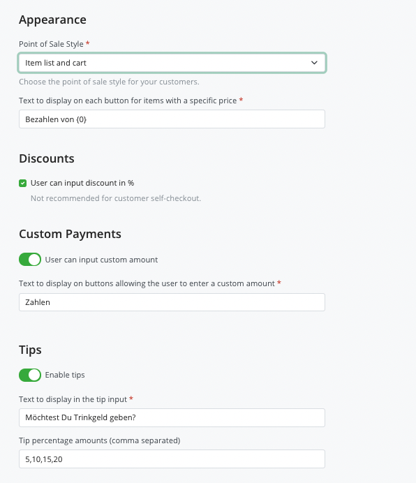Hier kann der Point of Sale Style festgelegt werden. Entweder nur als Keypad, als Auflistung der einzelnen Produkte oder als Auflistung der Produkte mit Warenkorb-Funktion.