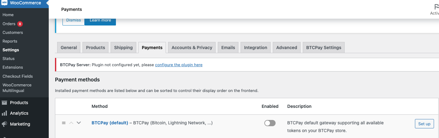 Wechsel zu WooCommerce => Settings => Payments und dort wird BTCPay als inaktiv aufgelistet.