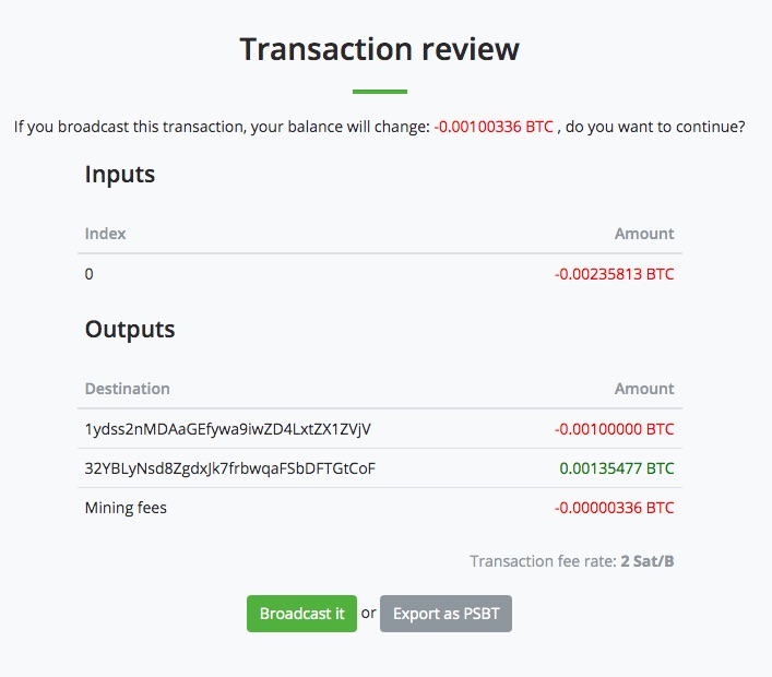 Wir erhalten dann noch einmal eine Übersicht der Transaktionen und klicken dann auf Broadcast it